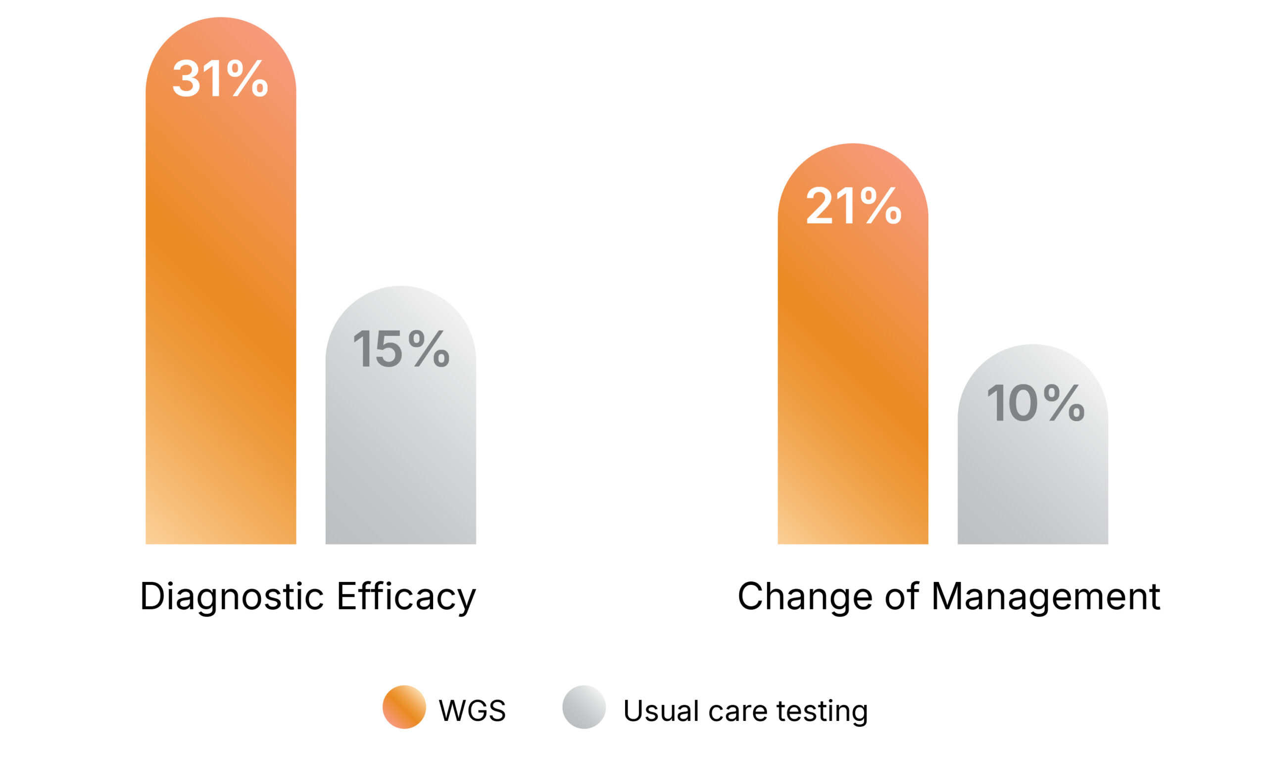 Finding the right diagnosis for a patient with a rare genetic disease can lead to improved clinical management. WGS has shown to have a higher diagnostic efficacy, changing clinical management for neonatal intensive care unit (NICU) patients by two-fold compared to standard testing.3 Introducing WGS in the NICU changes the strategy for the most vulnerable babies affected by suspected genetic disease.